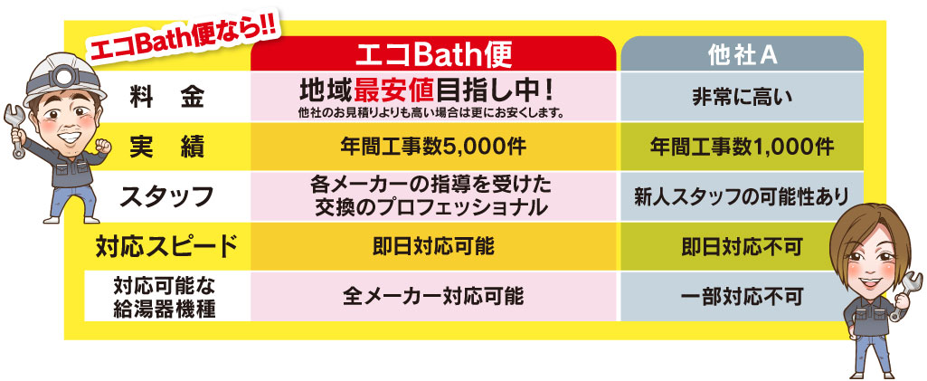 エコBath便なら、料金、実績、スタッフ、対応スピード、給湯器機種、すべて自信があります!以下の表をご覧ください!!料金は地域最安値目指し中ですので、他社のお見積りよりも高い場合は、是非一度ご相談ください!更にお安くさせていただきます!!