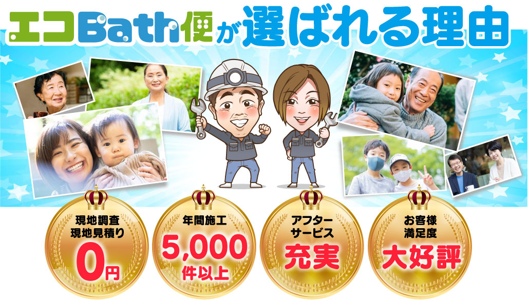 エコBath便の施工実績は、年間5,000件以上です! 地域最安値を目指した激安価格にてご提供しつつ、安心安全の施工体制で品質にこだわった工事を行っております。